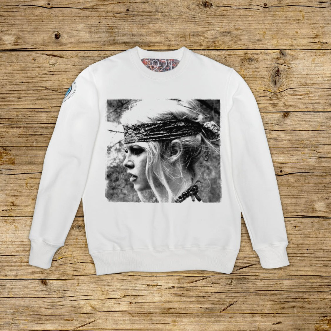 Felpa girocollo dalla vestibilità regolare realizzata in cotone strutturato dalla grammatura importante, nella particolare colorazione OFF WHITE con stampa di alta qualità. Il capo è impreziosito da una PATCH in materiale microiniezione sulla spalla destra riportante l' iconico logo 1921 con ologramma. Il modello è completato da collo, polsini e vita a coste. Un' etichetta di grandi dimensioni in jacquard è applicata all'interno del collo. Rigorosamente made in Italy