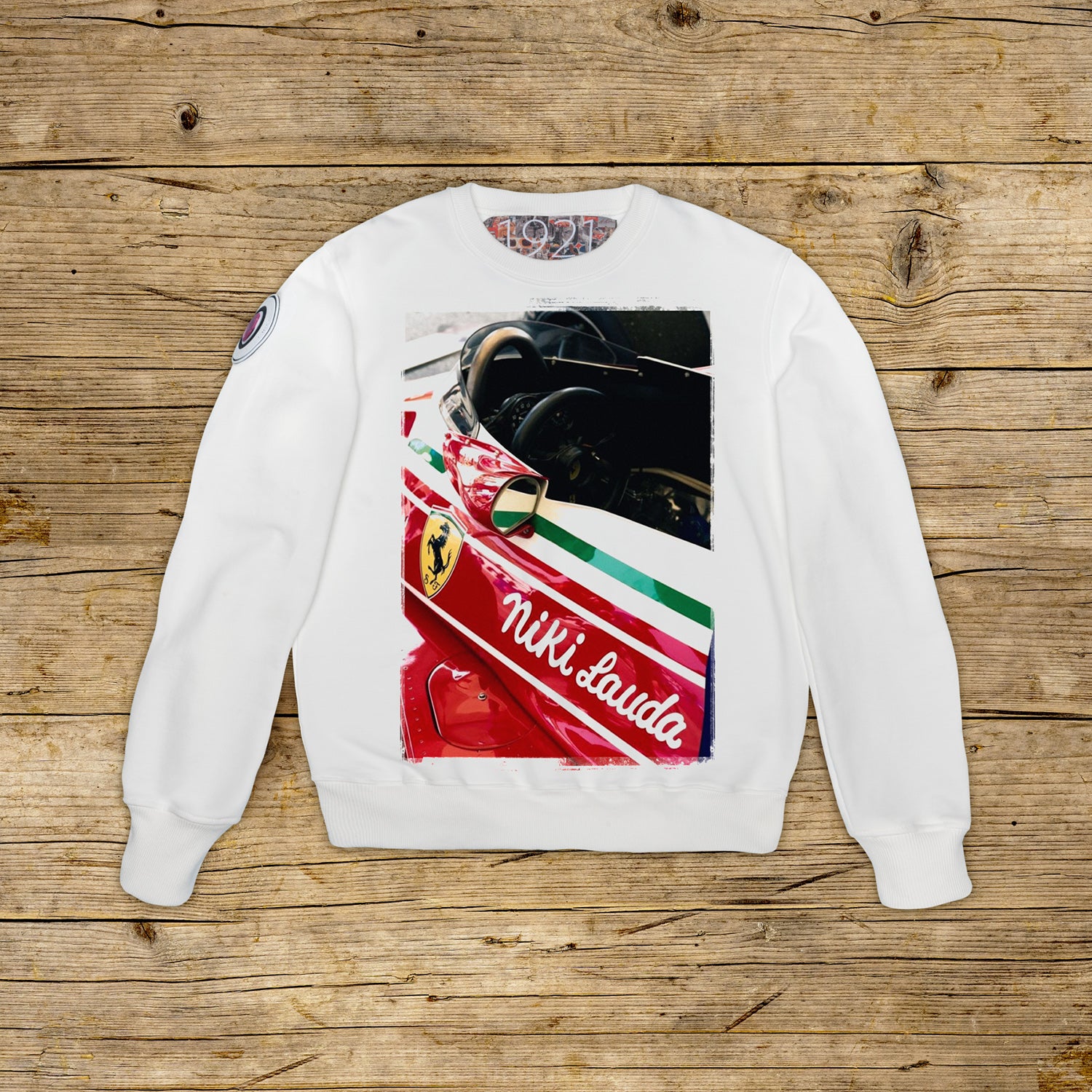 Felpa girocollo dalla vestibilità regolare realizzata in cotone strutturato dalla grammatura importante, nella particolare colorazione OFF WHITE con stampa di alta qualità. Il capo è impreziosito da una PATCH in materiale microiniezione sulla spalla destra riportante l' iconico logo 1921 con ologramma. Il modello è completato da collo, polsini e vita a coste. Un' etichetta di grandi dimensioni in jacquard è applicata all'interno del collo. Rigorosamente made in Italy