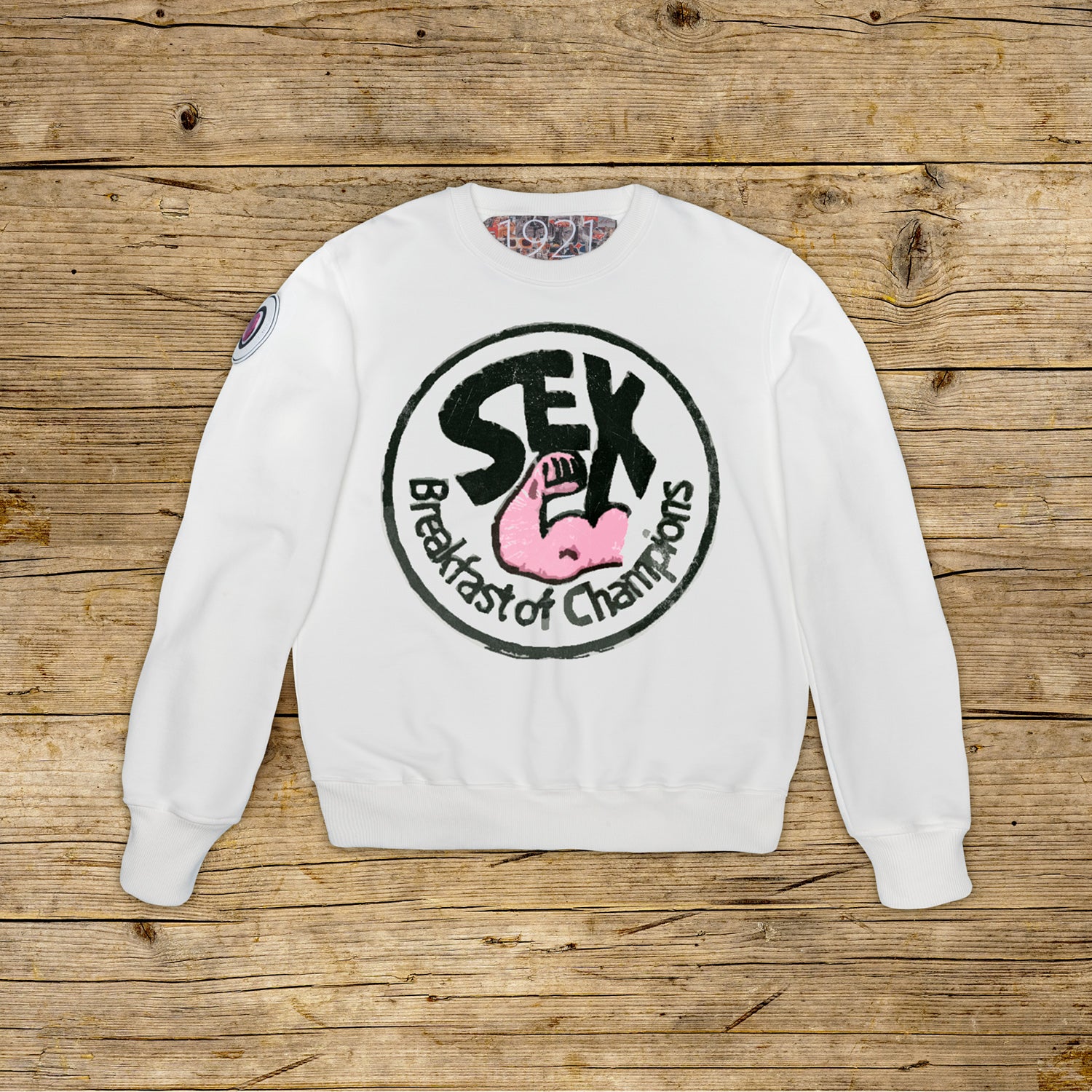 Felpa girocollo dalla vestibilità regolare realizzata in cotone strutturato dalla grammatura importante, nella particolare colorazione OFF WHITE con stampa di alta qualità. Il capo è impreziosito da una PATCH in materiale microiniezione sulla spalla destra riportante l' iconico logo 1921 con ologramma. Il modello è completato da collo, polsini e vita a coste. Un' etichetta di grandi dimensioni in jacquard è applicata all'interno del collo. Rigorosamente made in Italy