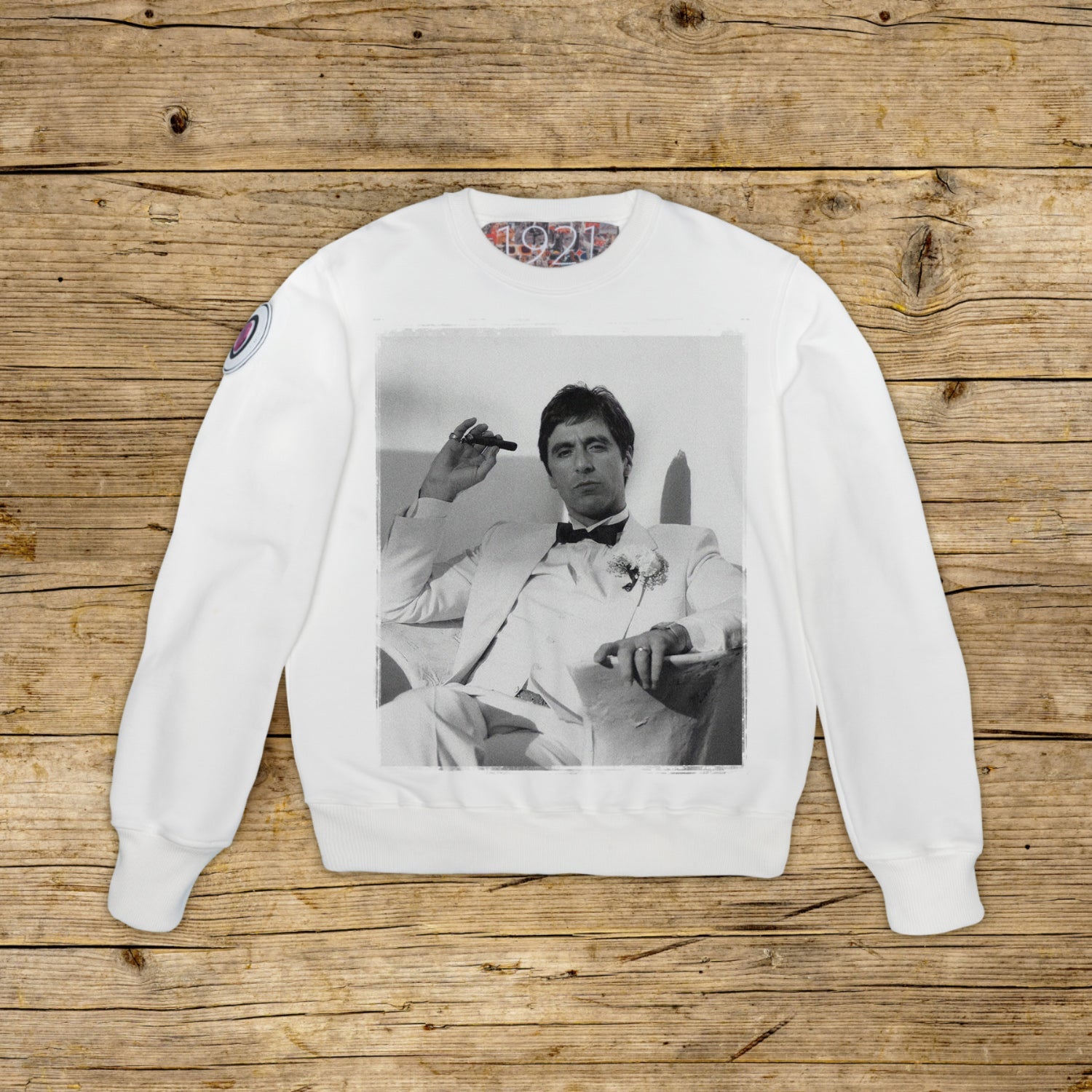 Mikina běžného střihu s výstřihem ze strukturované bavlny s vysokou gramáží, v barvě OFF WHITE s vysoce kvalitním potiskem. Oděv zdobí nášivka z mikrovstřikovaného materiálu na pravém rameni s ikonickým logem 1921 s hologramem. Model doplňuje žebrovaný límec, manžety a pas. Na vnitřní straně krku je aplikován velký žakárový štítek. Přísně vyrobeno v Itálii.