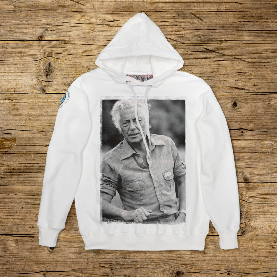 Dvojitá mikina s kapucí pravidelného střihu ze strukturované bavlny o vysoké gramáži v konkrétní barvě OFF WHITE s kvalitním potiskem. Oděv zdobí nášivka z mikrovstřikovaného materiálu na pravém rameni s ikonickým logem 1921 s hologramem. Model je doplněn žebrovaným límcem, manžetami a pasem. Na vnitřní straně krku je aplikován velký žakárový štítek. Očka spojovacích tyčí kapoty jsou vyrobena ze zesílené oceli, stejně jako konec personalizované šňůry z roku 1921 Strictly made in Italy