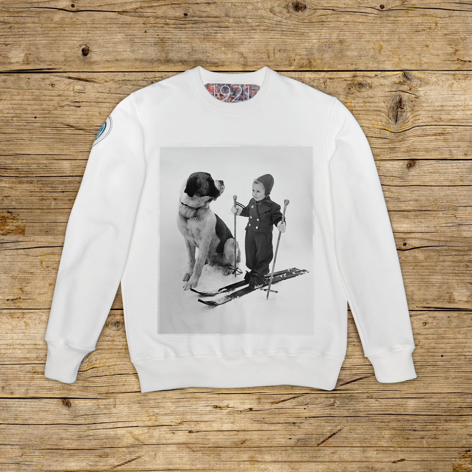 Crew-neck sweatshirt with a regular fit, crafted from structured cotton with substantial weight, in the distinctive OFF WHITE color with high-quality print. The piece features a PATCH in micro-injection material on the right shoulder bearing the iconic 1921 logo with hologram. Finished with ribbed collar, cuffs and hem. A large jacquard label is applied inside the collar. Made in Italy.