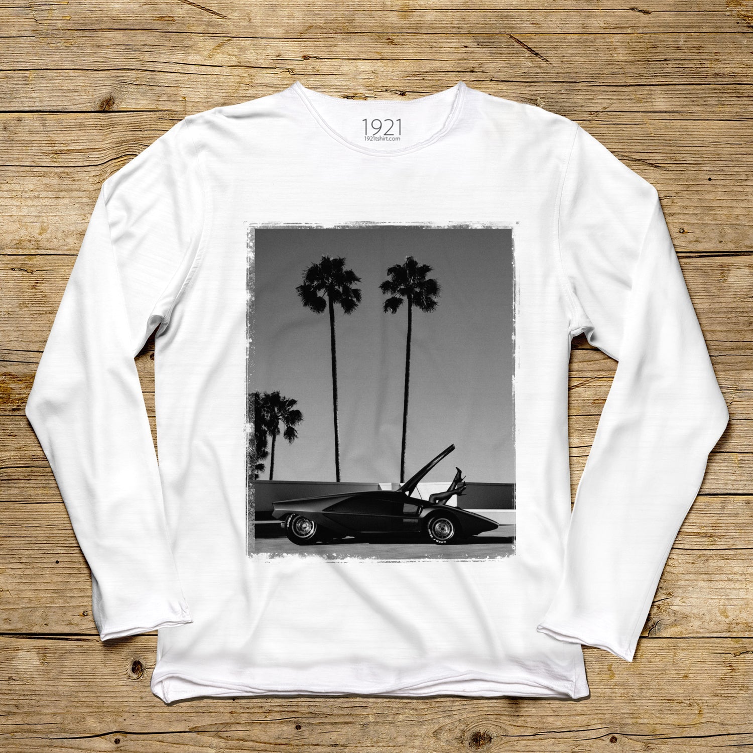 Una investigación sobre la pureza aerodinámica que trasciende el tiempo, donde destaca la afilada silueta del Lamborghini Countach como manifiesto del brutalismo mecánico. Este estampado realza el contraste material entre el rigor de las líneas geométricas y la atmósfera etérea de la Costa Oeste, inmortalizada en un blanco y negro denso de nostalgia visual. Un homenaje a la estética vanguardista y al poder formal, pensado para quienes interpretan el diseño como un diálogo constante entre la ingeniería y la iconografía urbana.
