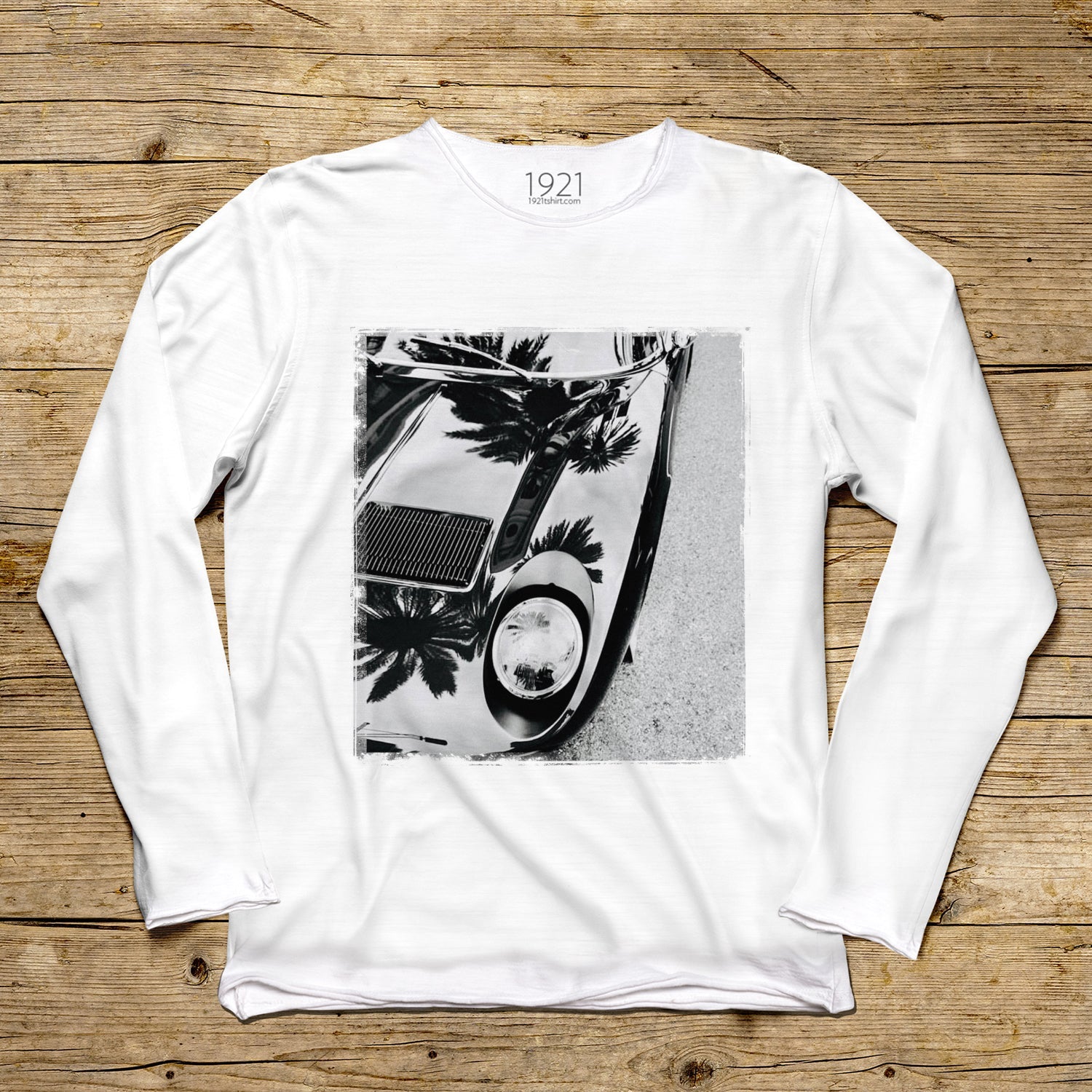 Un juego de reflejos transforma la carrocería en un lienzo espejado, celebrando el diseño orgánico del legendario Lamborghini Miura. Esta impresión captura un primer plano de la parte delantera, donde las siluetas de las palmeras se funden con las sinuosas curvas del coche en un blanco y negro texturizado de rara elegancia. Un homenaje al modernismo californiano y a la belleza plástica de las formas, pensado para quienes buscan una estética sofisticada que se nutre de los contrastes entre la rigidez del metal y la evocación de uneterno verano en la Costa Oeste.