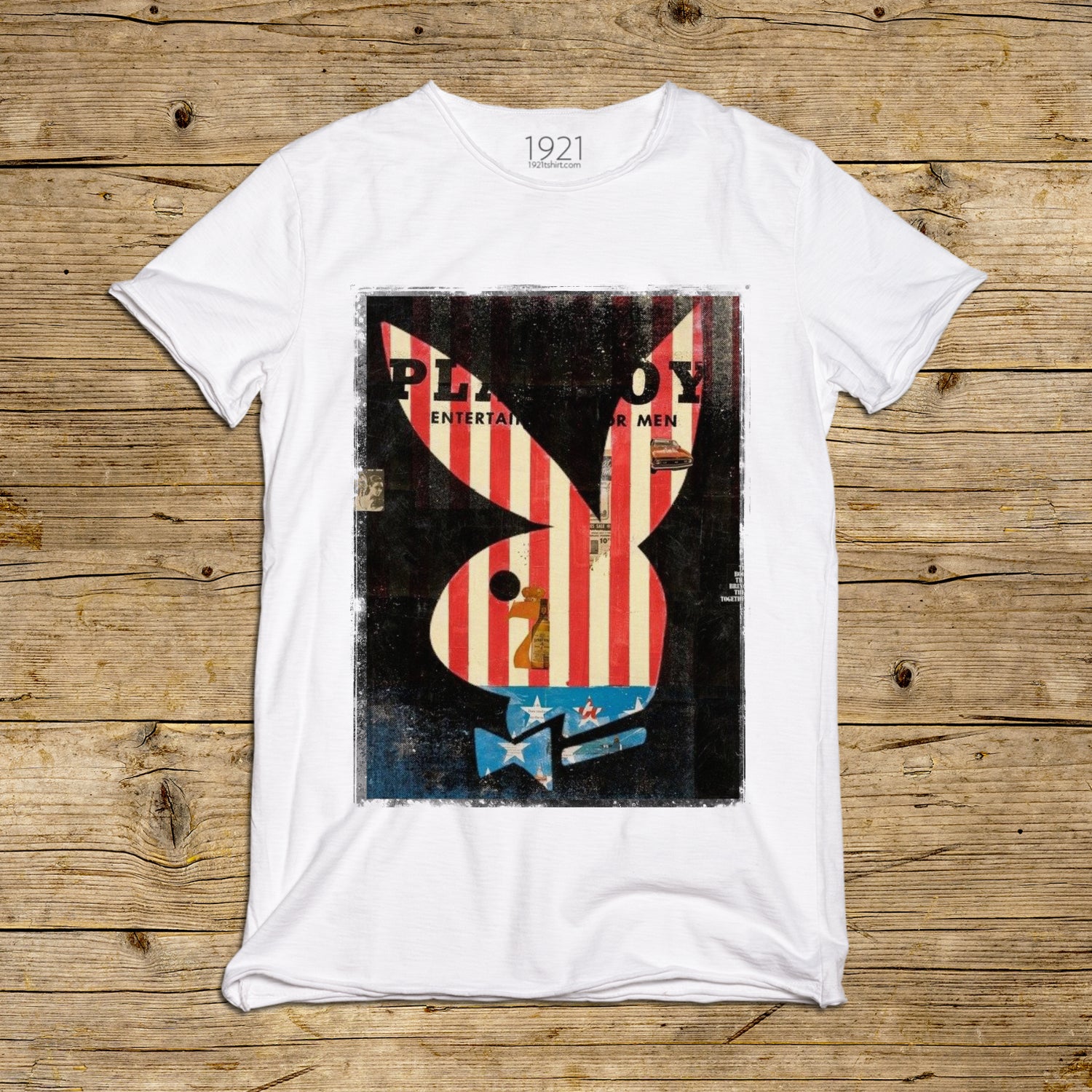Un'iconografia potente che fonde il mito di Playboy con l'estetica a stelle e strisce. Questa stampa reinterpreta il celebre Bunny attraverso un patchwork materico dove la bandiera americana diventa texture viva e usurata dal tempo. Un frame denso di audacia pop, pensato per chi ricerca una narrazione visiva che celebra il sogno americano con una purezza formale tagliente e sofisticata. Un pezzo di storia della cultura visiva trasformato in un manifesto di stile intramontabile.