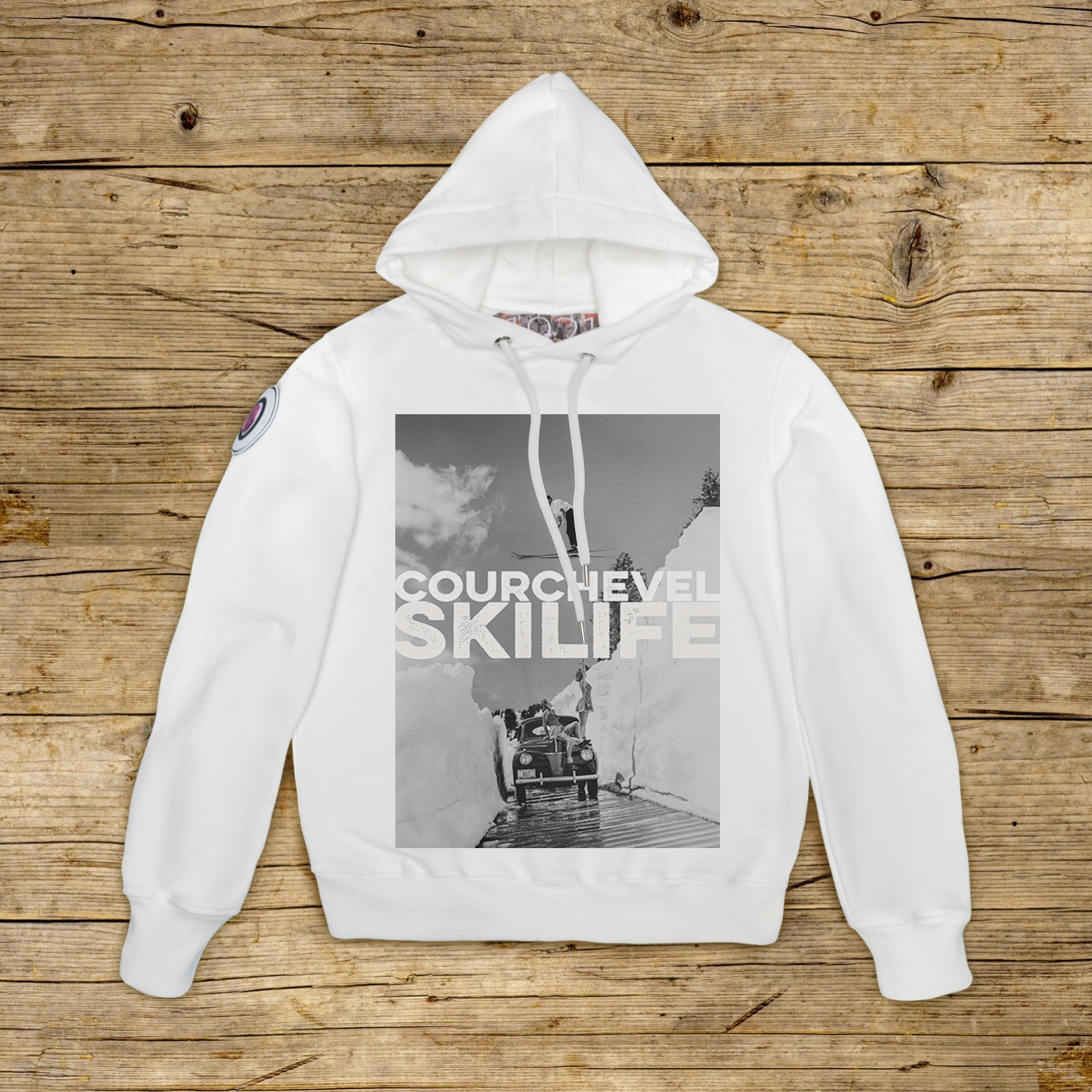 Hettegenser med dobbelt lag og regular passform, i strukturert bomull med høy vekt, i den karakteristiske fargen OFF WHITE med trykk av høy kvalitet. Plagget har en PATCH i mikroinjeksjonsmateriale på høyre skulder med det ikoniske 1921‑logoet med hologрам. Ribbestrikket hals, mansjetter og fald. Maljene til hettesnoren i kraftig stål og personlig 1921-snorkappe. Made in Italy.