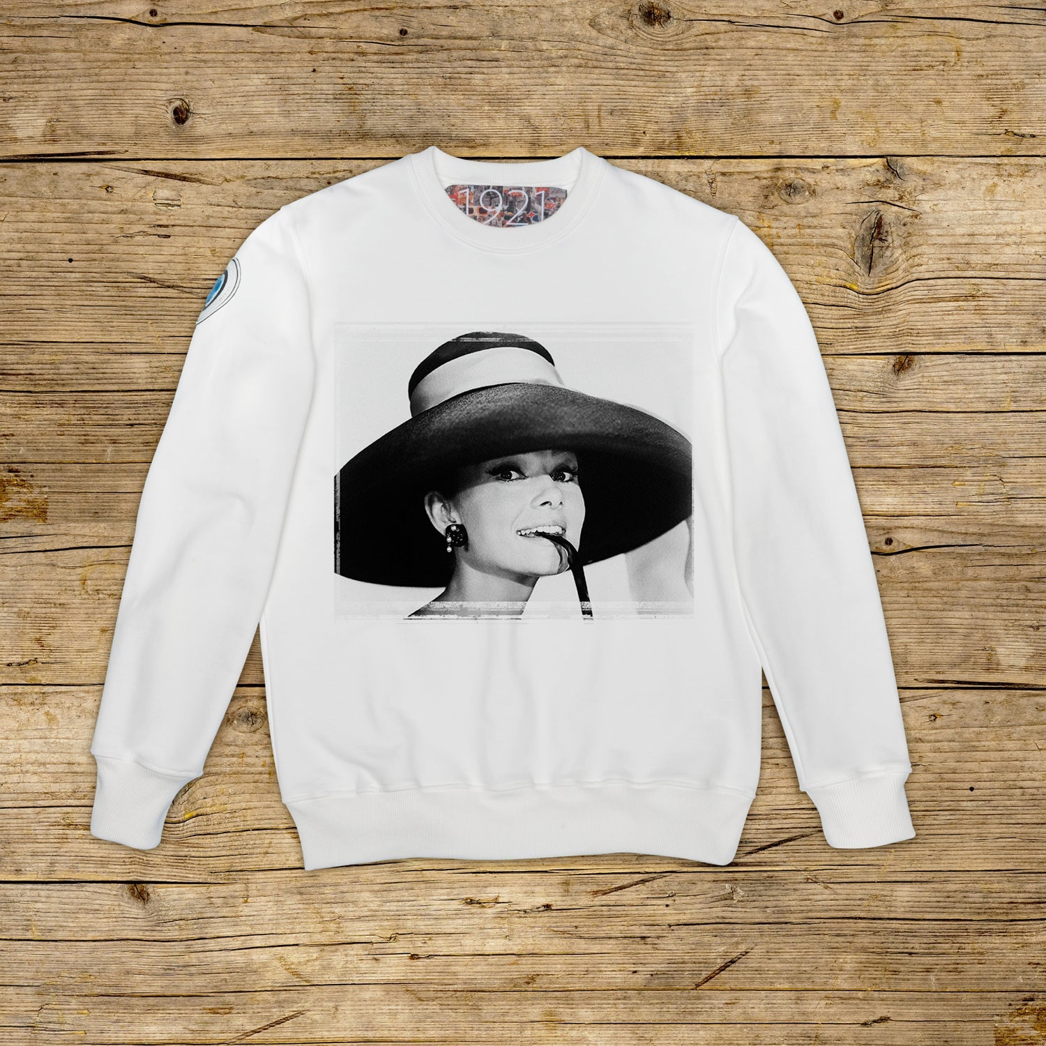 Bluza o regularnym kroju, z okrągłym dekoltem, wykonana z bawełny strukturalnej o dużej gramaturze, w szczególnym kolorze OFF WHITE z wysokiej jakości nadrukiem. Ubranie jest ozdobione naszywką z materiału mikrowtryskowego na prawym ramieniu, ozdobioną kultowym logo 1921 z hologramem. Model uzupełnia prążkowany kołnierzyk, mankiety i talia. Po wewnętrznej stronie szyi naszyta duża żakardowa metka. Wyprodukowano wyłącznie we Włoszech.