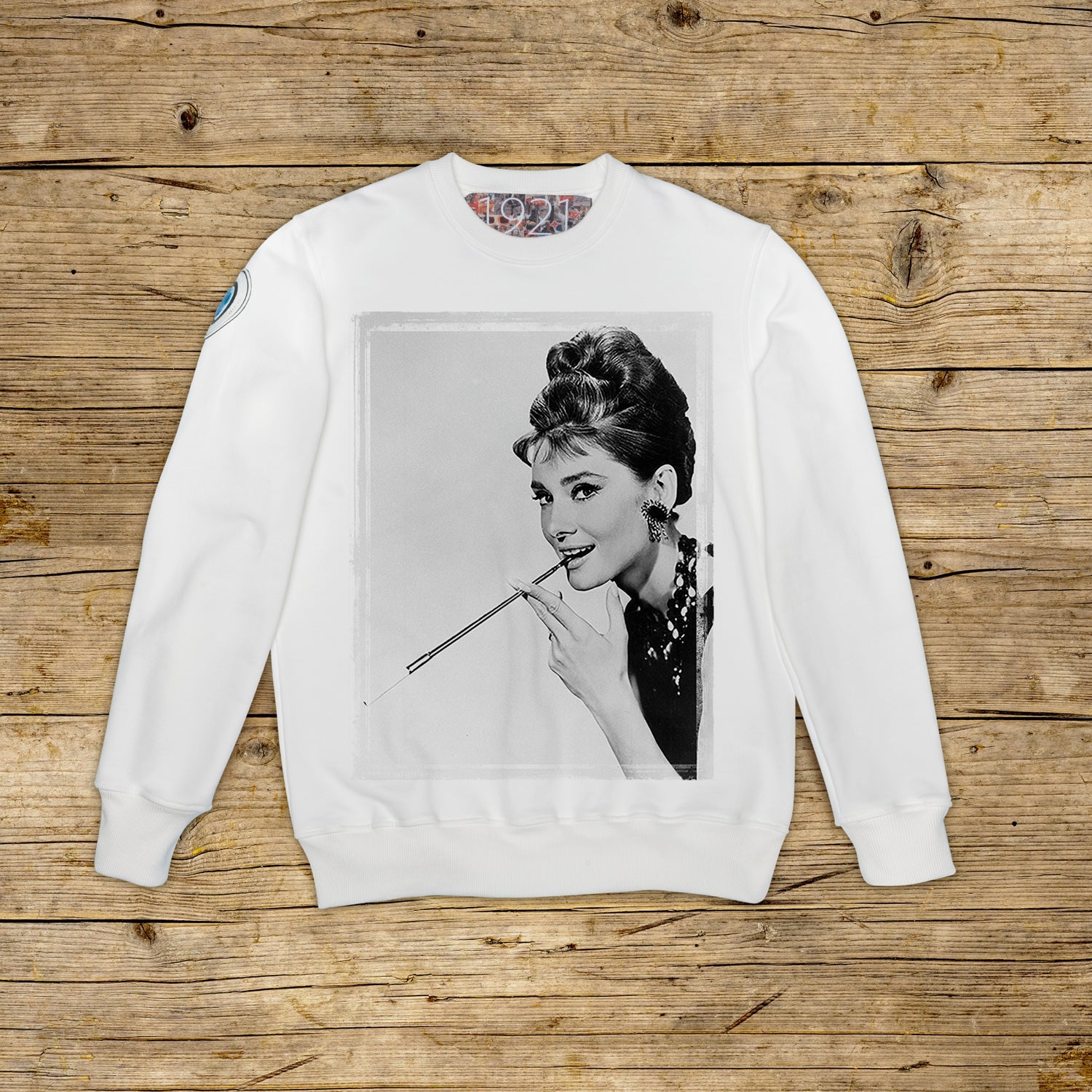 Bluza o regularnym kroju, z okrągłym dekoltem, wykonana z bawełny strukturalnej o dużej gramaturze, w szczególnym kolorze OFF WHITE z wysokiej jakości nadrukiem. Ubranie jest ozdobione naszywką z materiału mikrowtryskowego na prawym ramieniu, ozdobioną kultowym logo 1921 z hologramem. Model uzupełnia prążkowany kołnierzyk, mankiety i talia. Po wewnętrznej stronie szyi naszyta duża żakardowa metka. Wyprodukowano wyłącznie we Włoszech.