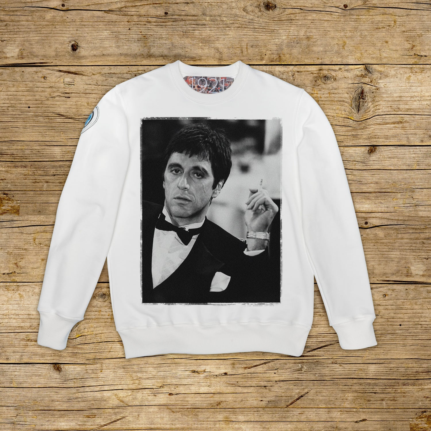 Bluza o regularnym kroju, z okrągłym dekoltem, wykonana z bawełny strukturalnej o dużej gramaturze, w szczególnym kolorze OFF WHITE z wysokiej jakości nadrukiem. Ubranie jest ozdobione naszywką z materiału mikrowtryskowego na prawym ramieniu, ozdobioną kultowym logo 1921 z hologramem. Model uzupełnia prążkowany kołnierzyk, mankiety i talia. Po wewnętrznej stronie szyi naszyta duża żakardowa metka. Wyprodukowano wyłącznie we Włoszech.