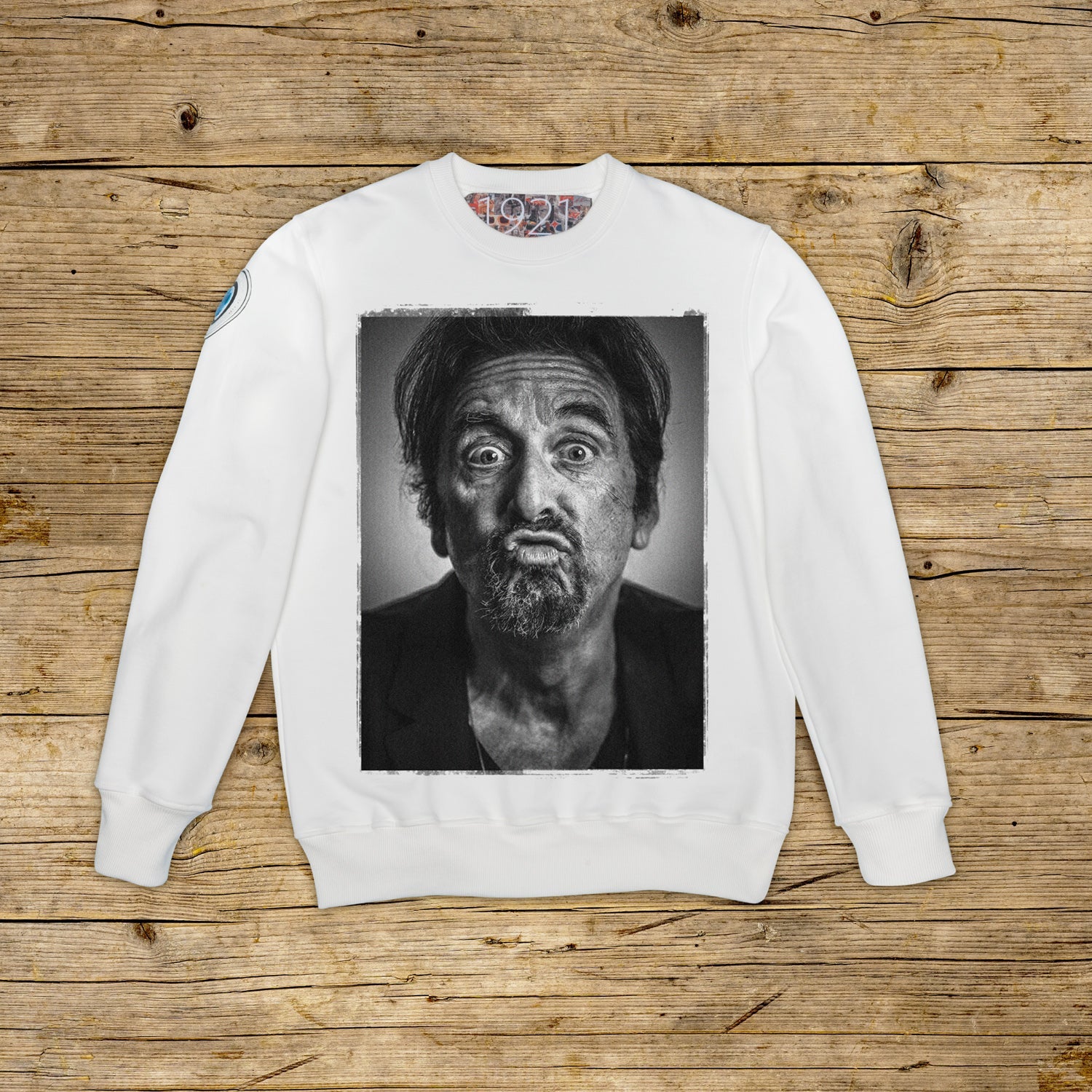 Bluza o regularnym kroju, z okrągłym dekoltem, wykonana z bawełny strukturalnej o dużej gramaturze, w szczególnym kolorze OFF WHITE z wysokiej jakości nadrukiem. Ubranie jest ozdobione naszywką z materiału mikrowtryskowego na prawym ramieniu, ozdobioną kultowym logo 1921 z hologramem. Model uzupełnia prążkowany kołnierzyk, mankiety i talia. Po wewnętrznej stronie szyi naszyta duża żakardowa metka. Wyprodukowano wyłącznie we Włoszech.