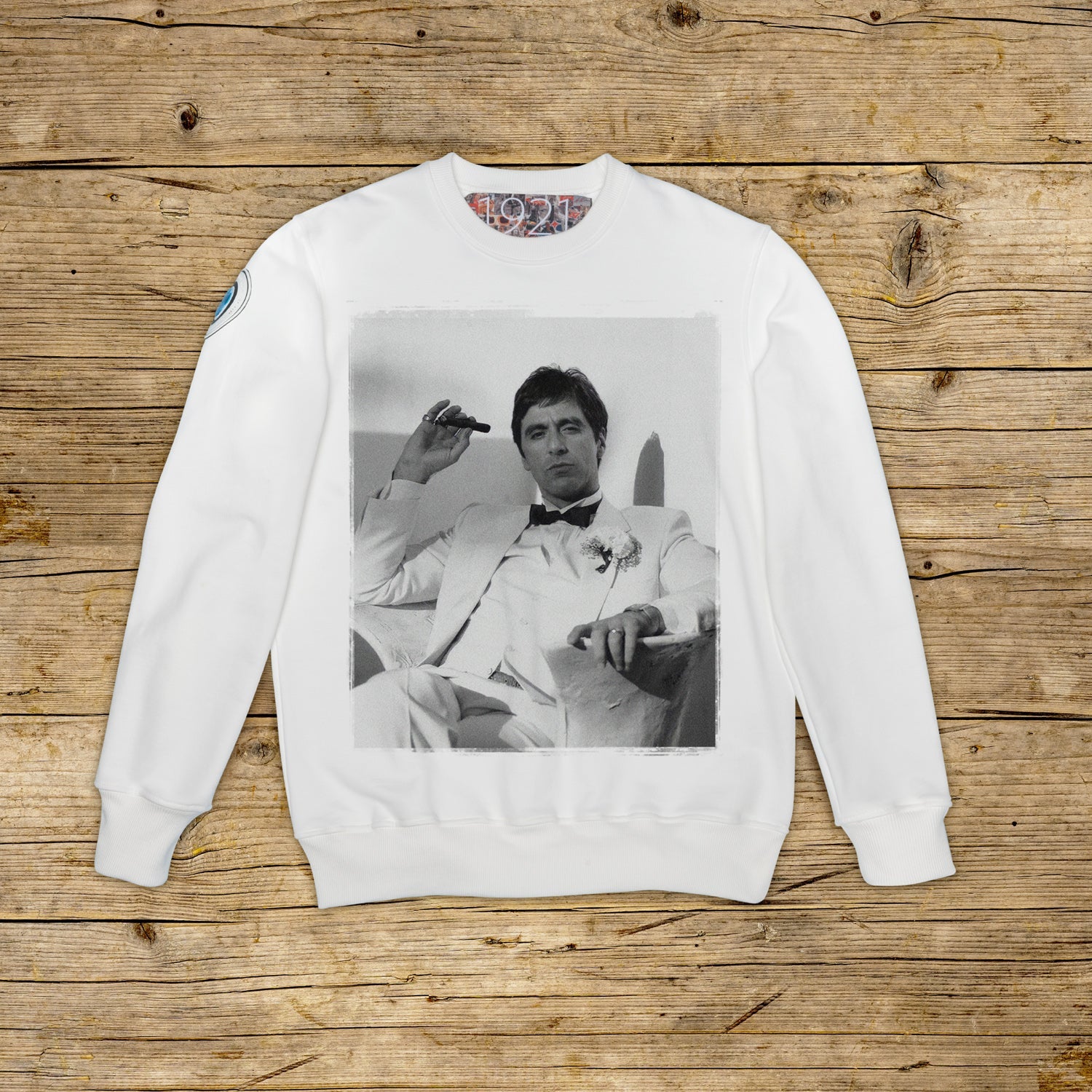 Bluza o regularnym kroju, z okrągłym dekoltem, wykonana z bawełny strukturalnej o dużej gramaturze, w szczególnym kolorze OFF WHITE z wysokiej jakości nadrukiem. Ubranie jest ozdobione naszywką z materiału mikrowtryskowego na prawym ramieniu, ozdobioną kultowym logo 1921 z hologramem. Model uzupełnia prążkowany kołnierzyk, mankiety i talia. Po wewnętrznej stronie szyi naszyta duża żakardowa metka. Wyprodukowano wyłącznie we Włoszech.