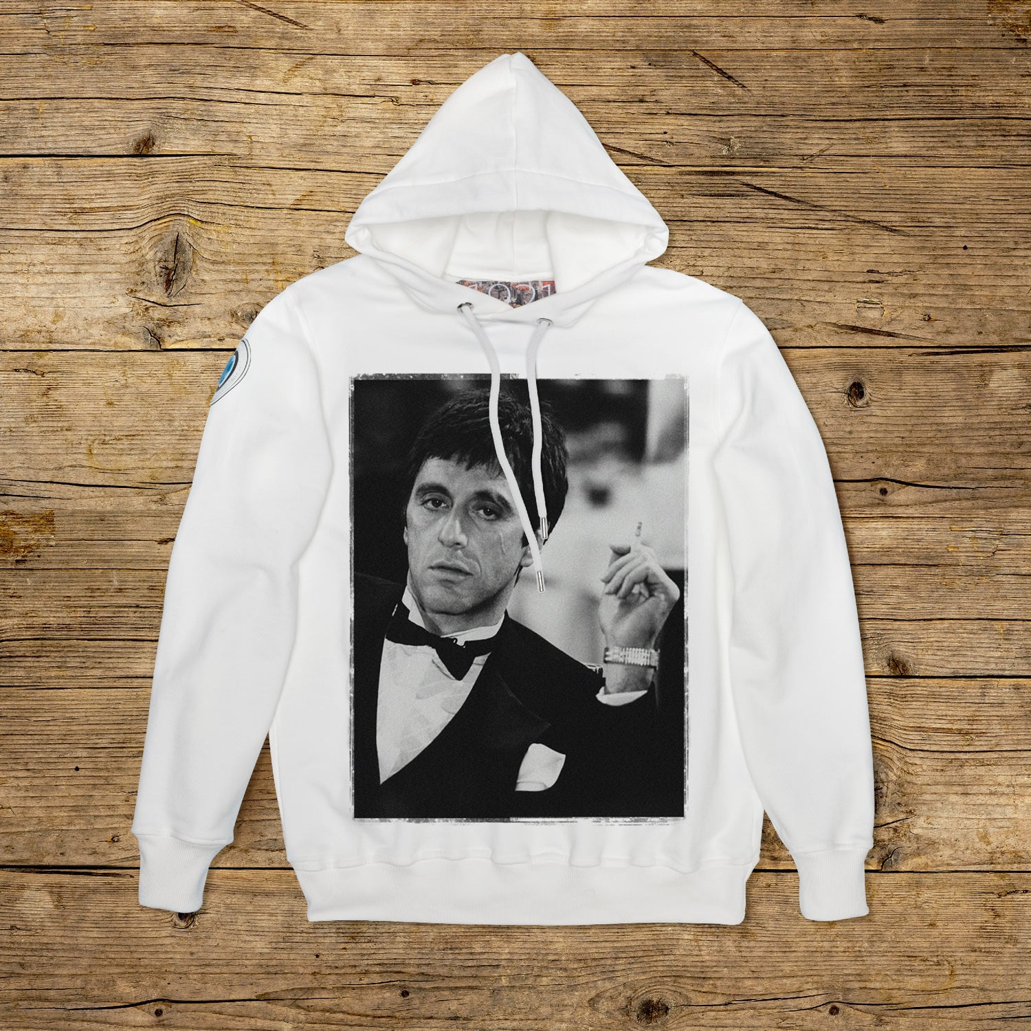Bluza z podwójnym kapturem o regularnym kroju, wykonana z bawełny strukturalnej o dużej gramaturze, w szczególnym kolorze OFF WHITE z wysokiej jakości nadrukiem. Ubranie jest ozdobione naszywką z materiału mikrowtryskowego na prawym ramieniu, ozdobioną kultowym logo 1921 z hologramem. Model uzupełnia prążkowany kołnierzyk, mankiety i talia. Po wewnętrznej stronie szyi naszyta duża żakardowa metka. Oczka cięgien maski są wykonane z pogrubionej stali, podobnie jak końcówka spersonalizowanego sznurka z 1921 r., wyprodukowanego wyłącznie we Włoszech.