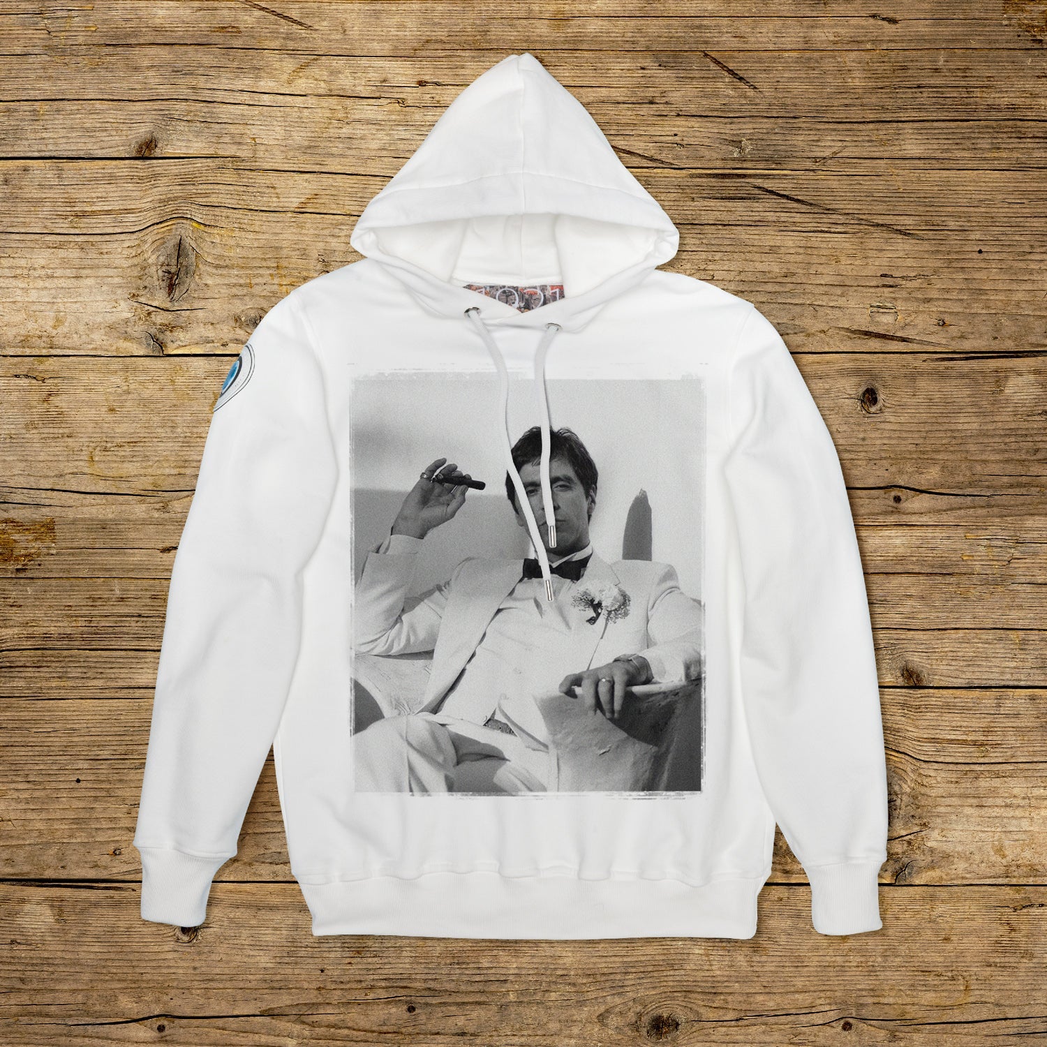 Bluza z podwójnym kapturem o regularnym kroju, wykonana z bawełny strukturalnej o dużej gramaturze, w szczególnym kolorze OFF WHITE z wysokiej jakości nadrukiem. Ubranie jest ozdobione naszywką z materiału mikrowtryskowego na prawym ramieniu, ozdobioną kultowym logo 1921 z hologramem. Model uzupełnia prążkowany kołnierzyk, mankiety i talia. Po wewnętrznej stronie szyi naszyta duża żakardowa metka. Oczka cięgien maski są wykonane z pogrubionej stali, podobnie jak końcówka spersonalizowanego sznurka z 1921 r., wyprodukowanego wyłącznie we Włoszech.