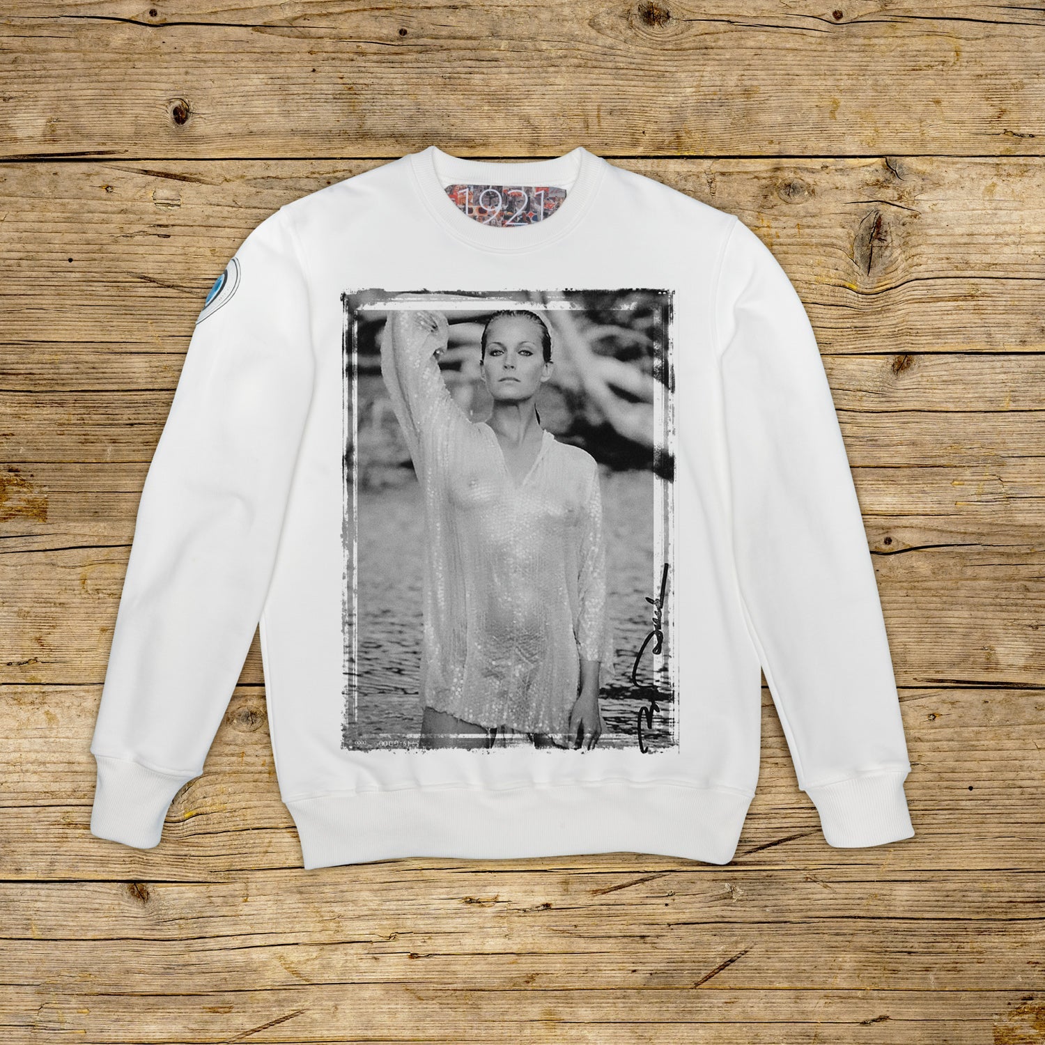Bluza o regularnym kroju, z okrągłym dekoltem, wykonana z bawełny strukturalnej o dużej gramaturze, w szczególnym kolorze OFF WHITE z wysokiej jakości nadrukiem. Ubranie jest ozdobione naszywką z materiału mikrowtryskowego na prawym ramieniu, ozdobioną kultowym logo 1921 z hologramem. Model uzupełnia prążkowany kołnierzyk, mankiety i talia. Po wewnętrznej stronie szyi naszyta duża żakardowa metka. Wyprodukowano wyłącznie we Włoszech.