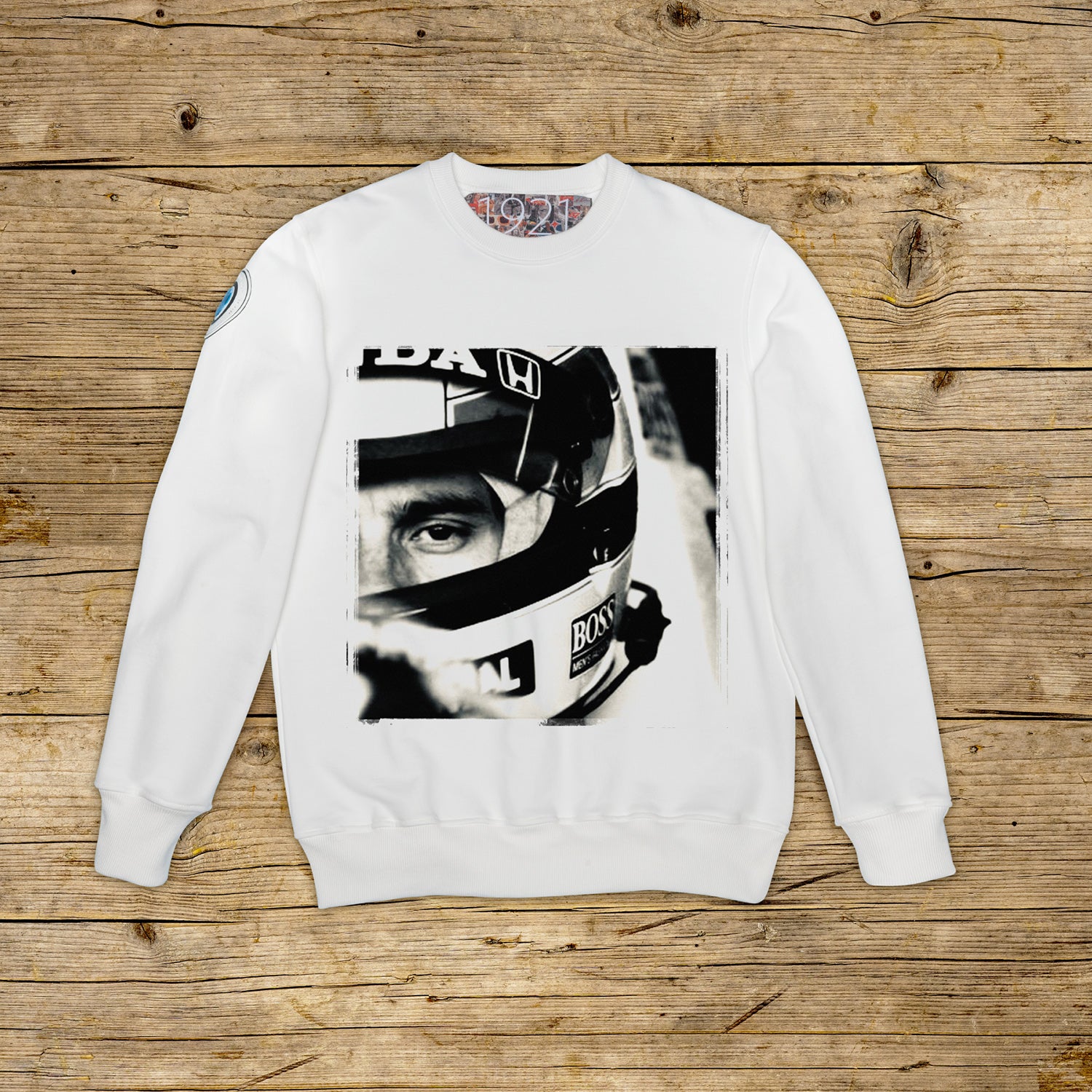 Bluza z okrągłym dekoltem o regularnym kroju, wykonana z bawełny strukturalnej o dużej gramaturze, w szczególnym kolorze OFF WHITE z wysokiej jakości nadrukiem. Ubranie jest ozdobione naszywką z materiału mikrowtryskowego na prawym ramieniu, ozdobioną kultowym logo 1921 z hologramem. Model uzupełnia prążkowany kołnierzyk, mankiety i talia. Po wewnętrznej stronie szyi naszyta duża żakardowa metka. Wyprodukowano wyłącznie we Włoszech
