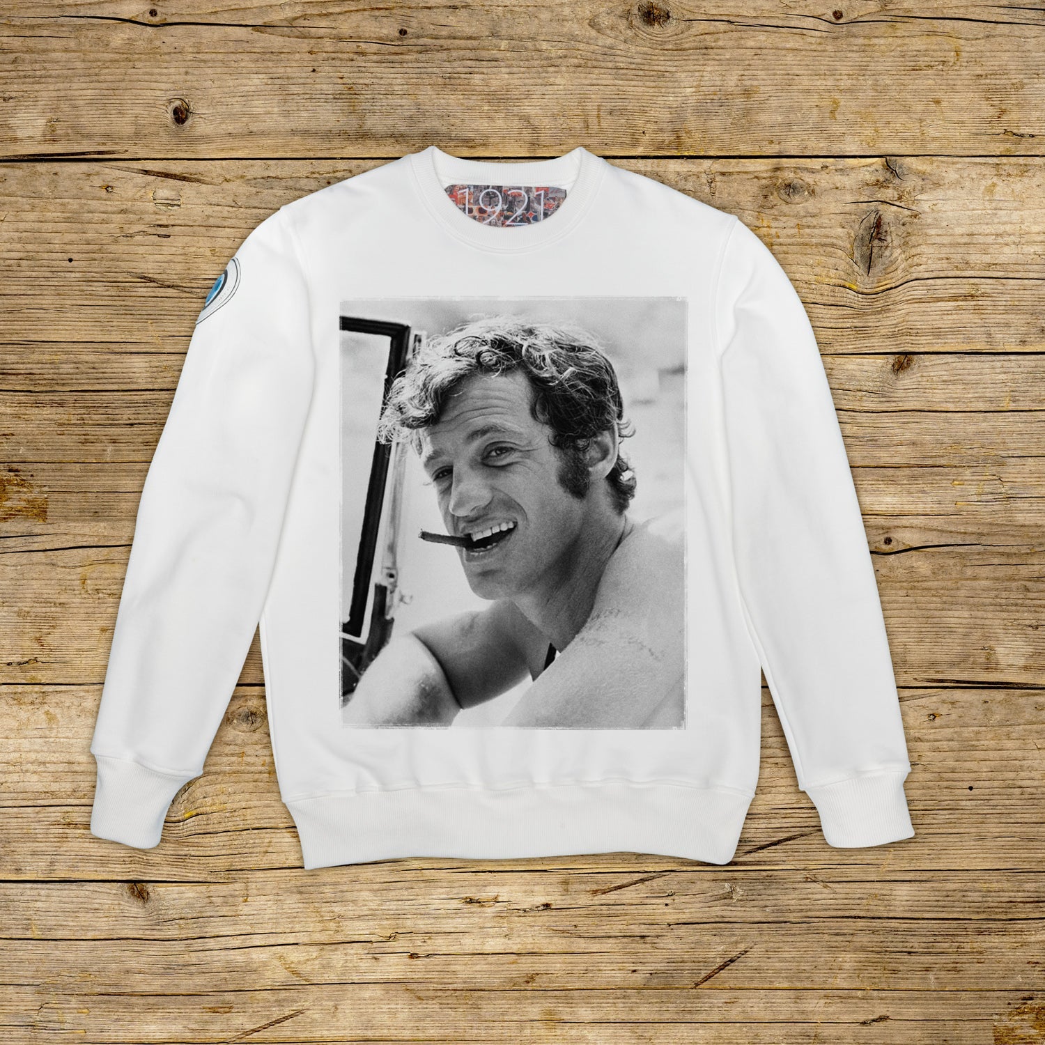 Bluza o regularnym kroju, z okrągłym dekoltem, wykonana z bawełny strukturalnej o dużej gramaturze, w szczególnym kolorze OFF WHITE z wysokiej jakości nadrukiem. Ubranie jest ozdobione naszywką z materiału mikrowtryskowego na prawym ramieniu, ozdobioną kultowym logo 1921 z hologramem. Model uzupełnia prążkowany kołnierzyk, mankiety i talia. Po wewnętrznej stronie szyi naszyta duża żakardowa metka. Wyprodukowano wyłącznie we Włoszech