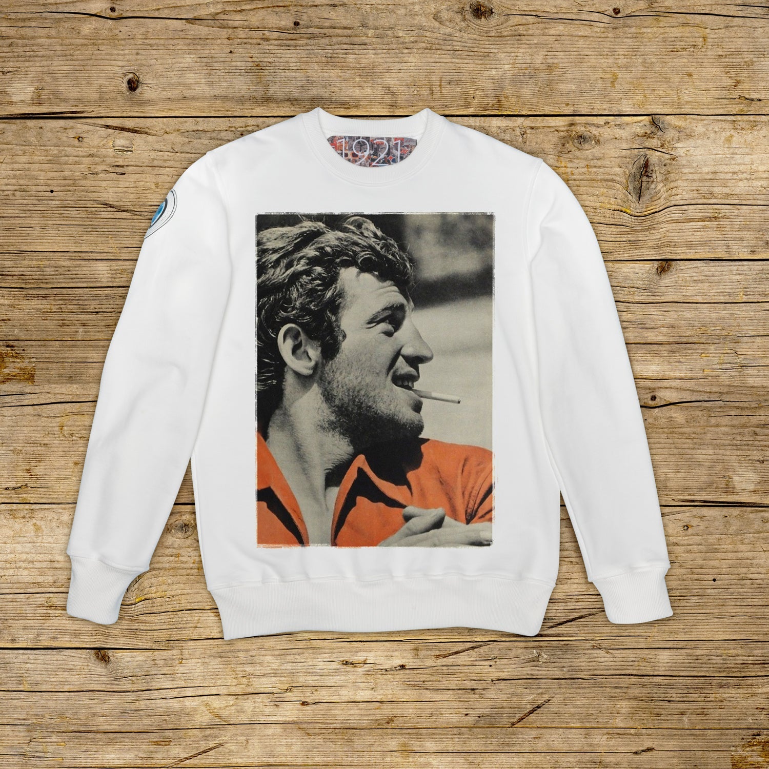 Bluza o regularnym kroju, z okrągłym dekoltem, wykonana z bawełny strukturalnej o dużej gramaturze, w szczególnym kolorze OFF WHITE z wysokiej jakości nadrukiem. Ubranie jest ozdobione naszywką z materiału mikrowtryskowego na prawym ramieniu, ozdobioną kultowym logo 1921 z hologramem. Model uzupełnia prążkowany kołnierzyk, mankiety i talia. Po wewnętrznej stronie szyi naszyta duża żakardowa metka. Wyprodukowano wyłącznie we Włoszech