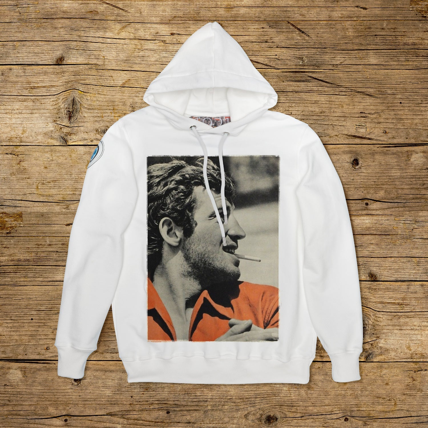 Bluza z podwójnym kapturem o regularnym kroju, wykonana z bawełny strukturalnej o dużej gramaturze, w szczególnym kolorze OFF WHITE z wysokiej jakości nadrukiem. Ubranie jest ozdobione naszywką z materiału mikrowtryskowego na prawym ramieniu, ozdobioną kultowym logo 1921 z hologramem. Model uzupełnia prążkowany kołnierzyk, mankiety i talia. Po wewnętrznej stronie szyi naszyta duża żakardowa metka. Oczka cięgien maski są wykonane z pogrubionej stali, podobnie jak końcówka spersonalizowanego sznurka z 1921 r., wyprodukowanego wyłącznie we Włoszech.