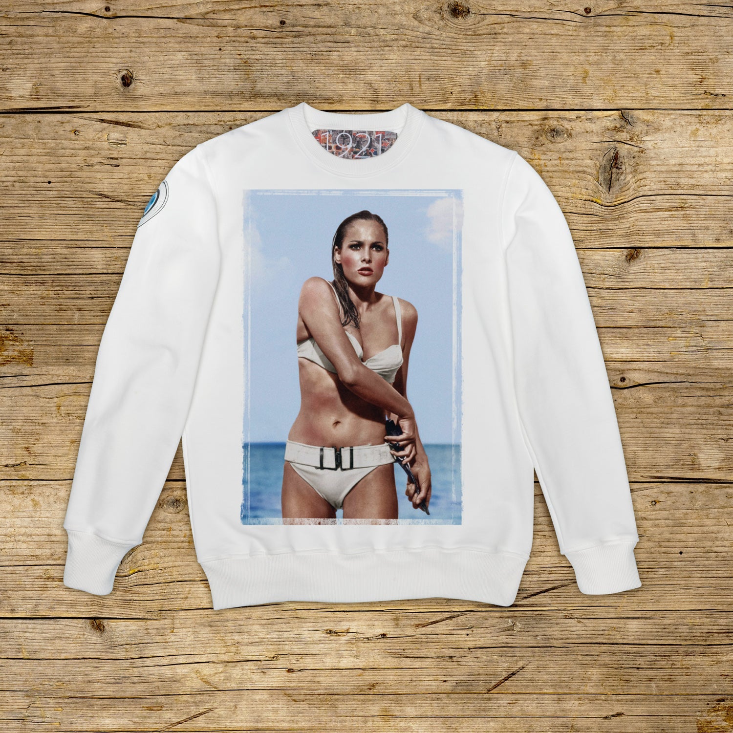 Bluza o regularnym kroju, z okrągłym dekoltem, wykonana z bawełny strukturalnej o dużej gramaturze, w szczególnym kolorze OFF WHITE z wysokiej jakości nadrukiem. Ubranie jest ozdobione naszywką z materiału mikrowtryskowego na prawym ramieniu, ozdobioną kultowym logo 1921 z hologramem. Model uzupełnia prążkowany kołnierzyk, mankiety i talia. Po wewnętrznej stronie szyi naszyta duża żakardowa metka. Wyprodukowano wyłącznie we Włoszech.