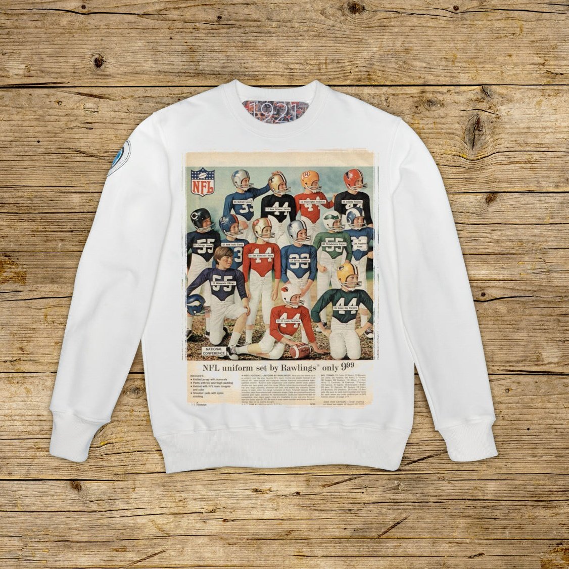 Bluza z okrągłym dekoltem o regularnym kroju, wykonana z bawełny strukturalnej o dużej gramaturze, w szczególnym kolorze OFF WHITE z wysokiej jakości nadrukiem. Ubranie jest ozdobione naszywką z materiału mikrowtryskowego na prawym ramieniu, ozdobioną kultowym logo 1921 z hologramem. Model uzupełnia prążkowany kołnierzyk, mankiety i talia. Po wewnętrznej stronie szyi naszyta duża żakardowa metka. Wyprodukowano wyłącznie we Włoszech