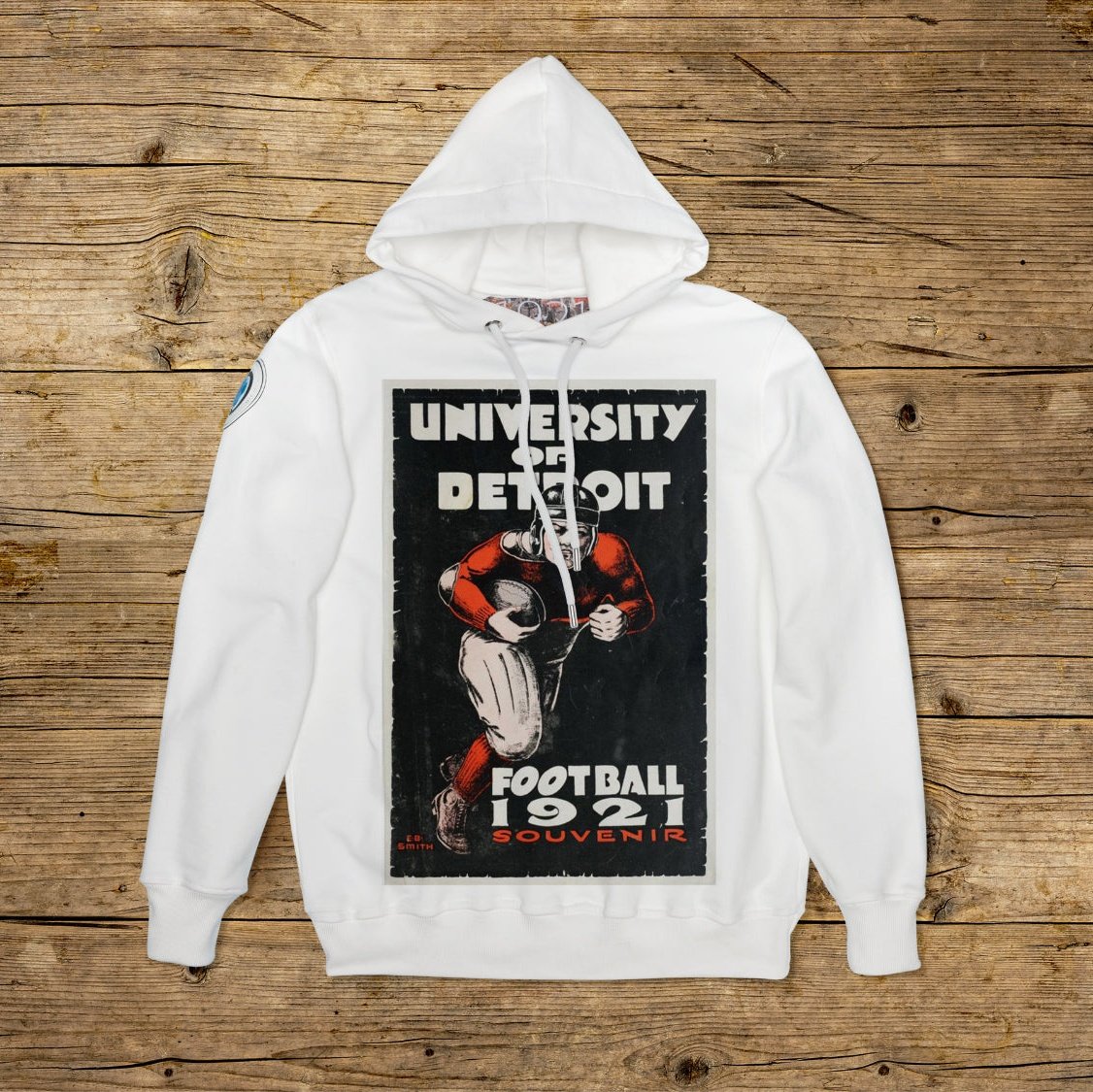 Bluza z podwójnym kapturem o regularnym kroju, wykonana z bawełny strukturalnej o dużej gramaturze, w szczególnym kolorze OFF WHITE z wysokiej jakości nadrukiem. Ubranie jest ozdobione naszywką z materiału mikrowtryskowego na prawym ramieniu, ozdobioną kultowym logo 1921 z hologramem. Model uzupełnia prążkowany kołnierzyk, mankiety i talia. Po wewnętrznej stronie szyi naszyta duża żakardowa metka. Oczka cięgien maski są wykonane z pogrubionej stali, podobnie jak końcówka spersonalizowanego sznurka z 1921 r. Wyprodukowano wyłącznie we Włoszech