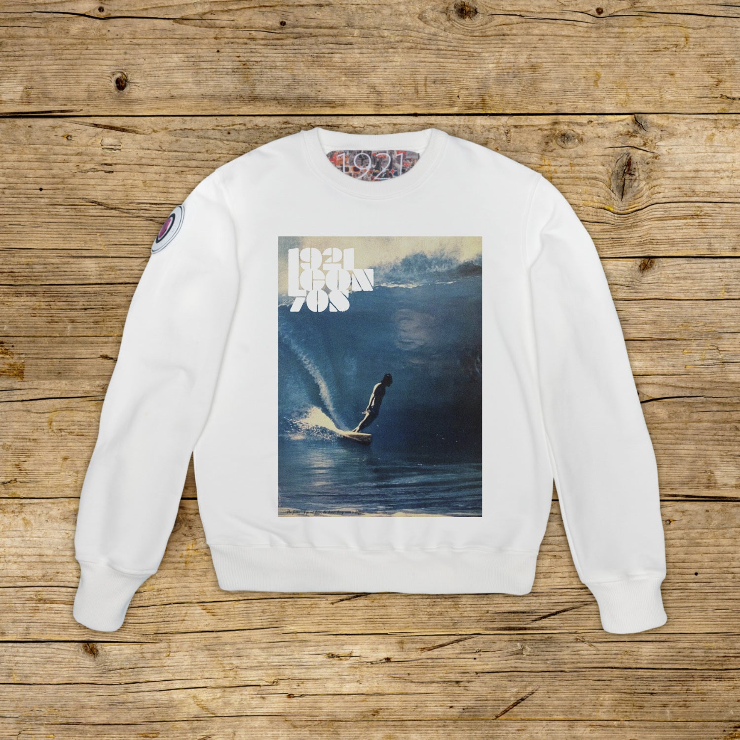Moletom de gola redonda de corte regular confeccionado em algodão estruturado de alta gramatura, na cor particular OFF WHITE com estampa de alta qualidade. A peça é embelezada com um PATCH em material de microinjeção no ombro direito com o icônico logotipo 1921 com holograma. O modelo é completado por gola, punhos e cintura canelados. Uma grande etiqueta jacquard é aplicada na parte interna do pescoço. Fabricado estritamente na Itália.