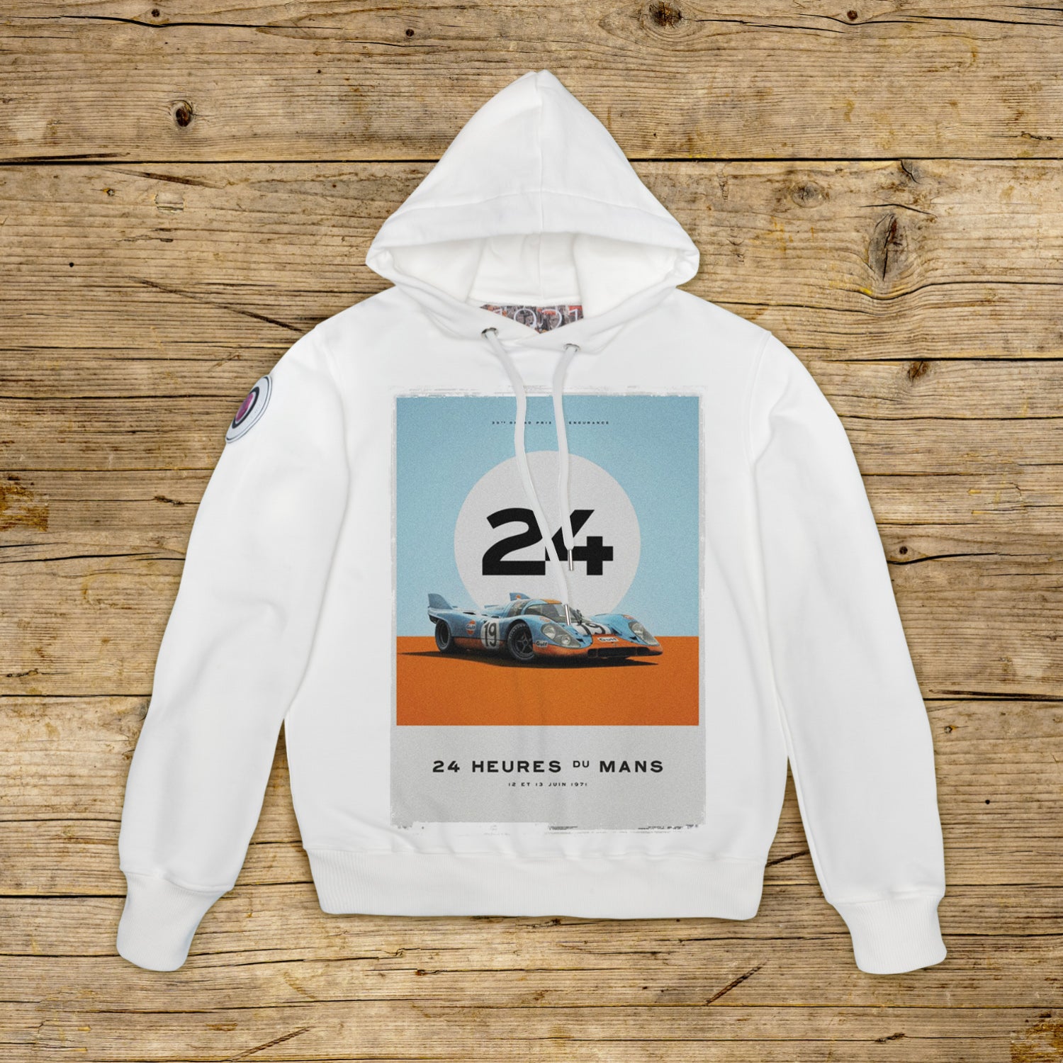 Dvojni pulover s kapuco in navadnim krojem iz strukturiranega bombaža z visoko težo, posebne OFF WHITE barve z visokokakovostnim tiskom. Oblačilo je na desni rami okrašeno z OBLIŽOM iz materiala za mikrobrizganje, na katerem je ikonični logotip 1921 s hologramom. Model dopolnjujejo rebrasti ovratnik, manšete in pas. Na notranji strani vratu je pritrjena velika žakard etiketa. Očesca veznih palic za pokrov motorja so iz odebeljenega jekla, prav tako tudi konec personalizirane vrvice iz leta 1921, izdelane strogo v Italiji.
