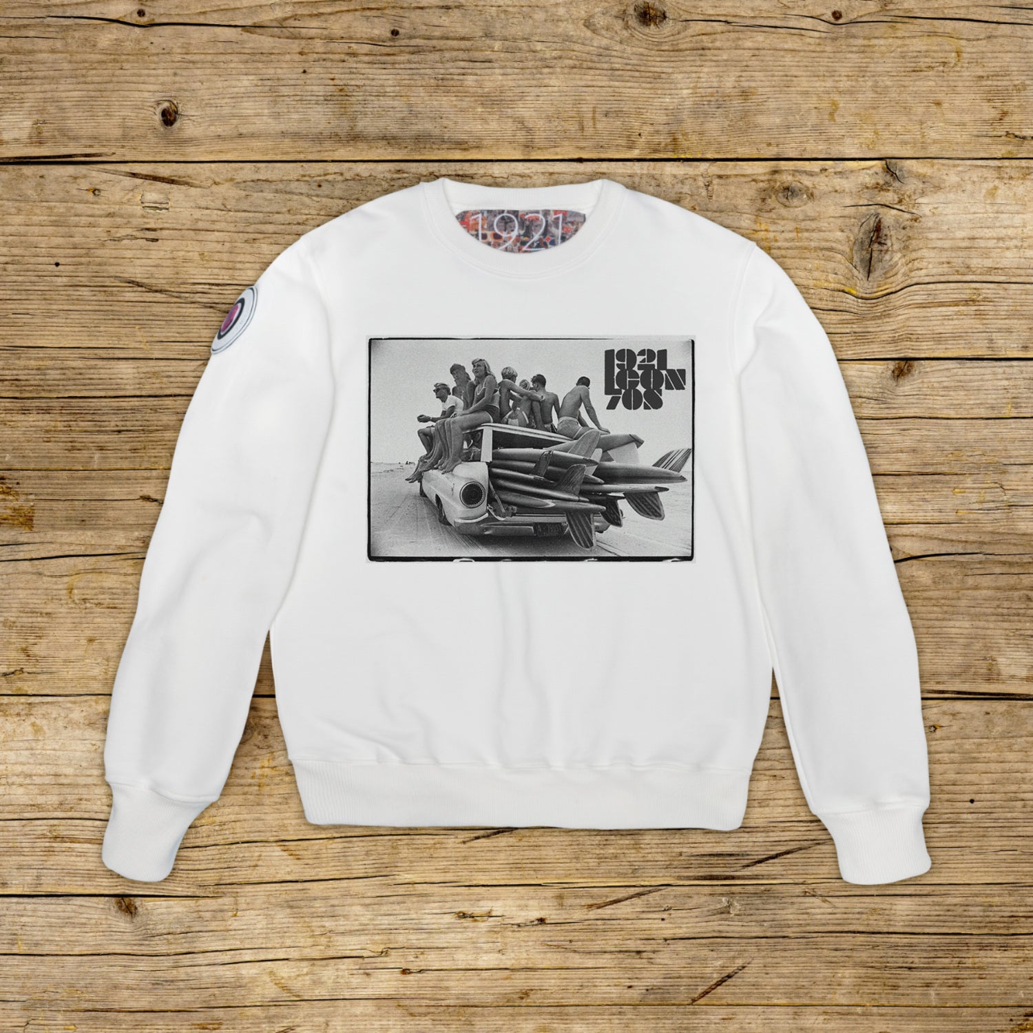 Regular fit pulover z okroglim izrezom iz strukturiranega bombaža z visoko težo, v posebni OFF WHITE barvi z visokokakovostnim tiskom. Oblačilo je na desni rami okrašeno z OBLIŽOM iz materiala za mikrobrizganje, na katerem je ikonični logotip 1921 s hologramom. Model dopolnjujejo rebrasti ovratnik, manšete in pas. Na notranji strani vratu je pritrjena velika žakard etiketa. Strogo izdelano v Italiji.