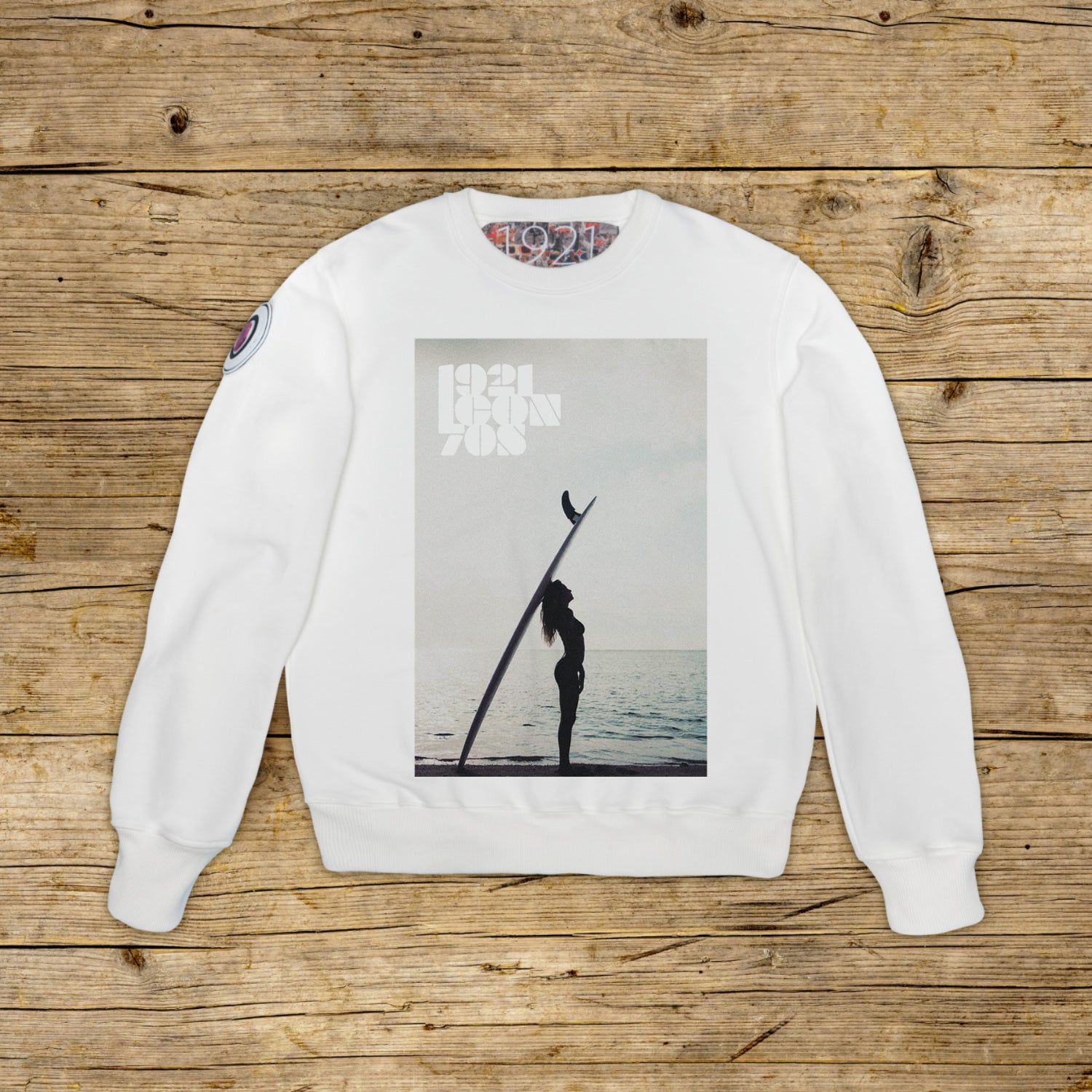 Regular fit pulover z okroglim izrezom iz strukturiranega bombaža z visoko težo, v posebni OFF WHITE barvi z visokokakovostnim tiskom. Oblačilo je na desni rami okrašeno z OBLIŽOM iz materiala za mikrobrizganje, na katerem je ikonični logotip 1921 s hologramom. Model dopolnjujejo rebrasti ovratnik, manšete in pas. Na notranji strani vratu je pritrjena velika žakard etiketa. Strogo izdelano v Italiji.